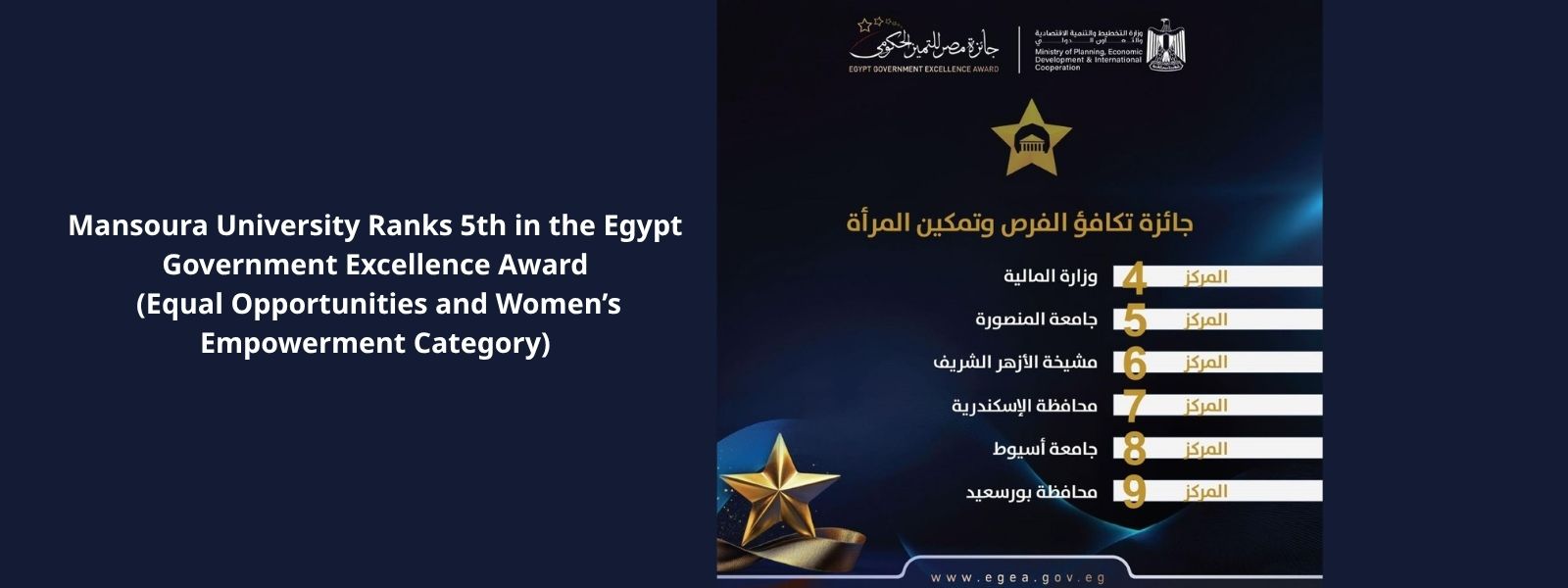 Mansoura University Ranks 5th in the Egypt Government Excellence Award (Equal Opportunities and Women’s Empowerment Category – 4th Cycle)