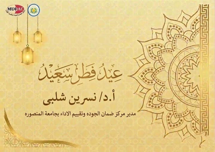 تتقدم السيدة ا.د/ نسرين شلبى مدير مركز ضمان الجودة وتقييم الأداء بجامعة المنصورة، بخالص التهنئة إلى معالي الأستاذ الدكتور/ شريف يوسف خاطر رئيس جامعة المنصورة، والسادة نواب رئيس الجامعة، والسادة عمداء ووكلاء الكليات والسيد أمين عام الجامعة، والسادة نواب مدير المركز والقيادات الأكاديمية والإدارية، وأعضاء هيئة التدريس والهيئة المعاونة، ومديرى ونواب وحدات ضمان الجودة بالجامعه والعاملين بالجهاز الإداري، والطلاب، بمناسبة عبد الفطر المبارك.